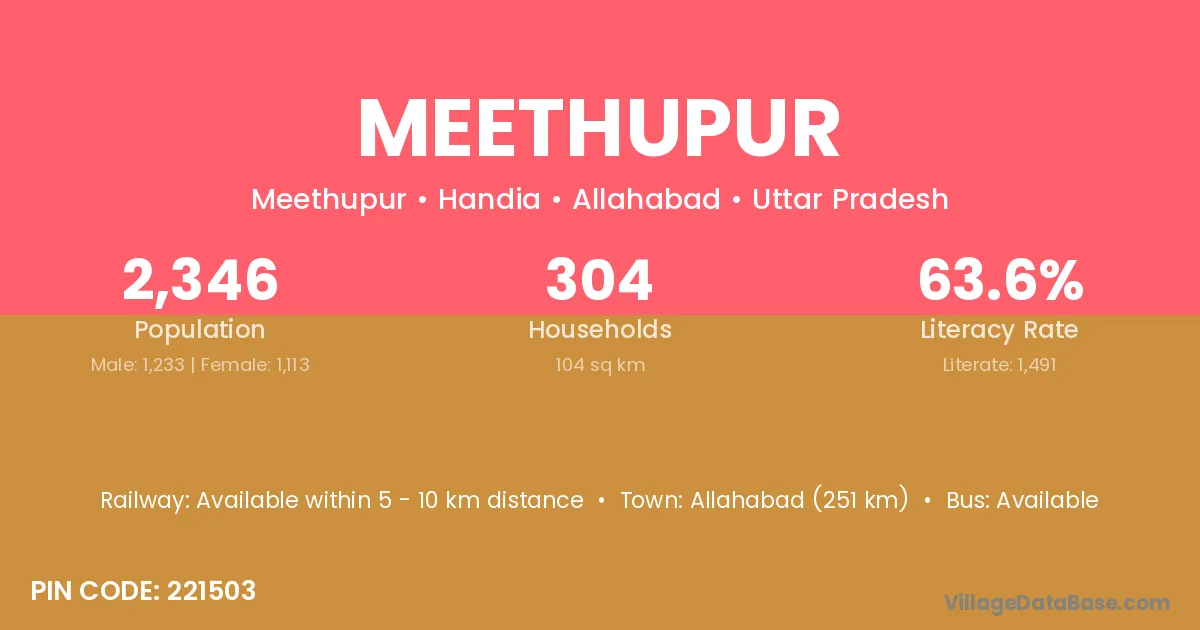 Allahabad (251 km) is the nearest town to Meethupur village for major economic activities and is located approximately 251 km away.
