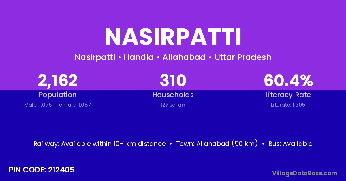 Allahabad (50 km) is the nearest town to Nasirpatti village for major economic activities and is located approximately 50 km away.