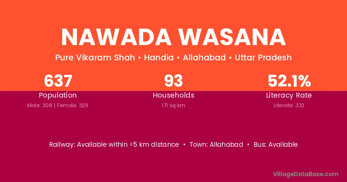 Nawada Wasana village has a total population of 637 people, of which 308 are males and 329 are females.