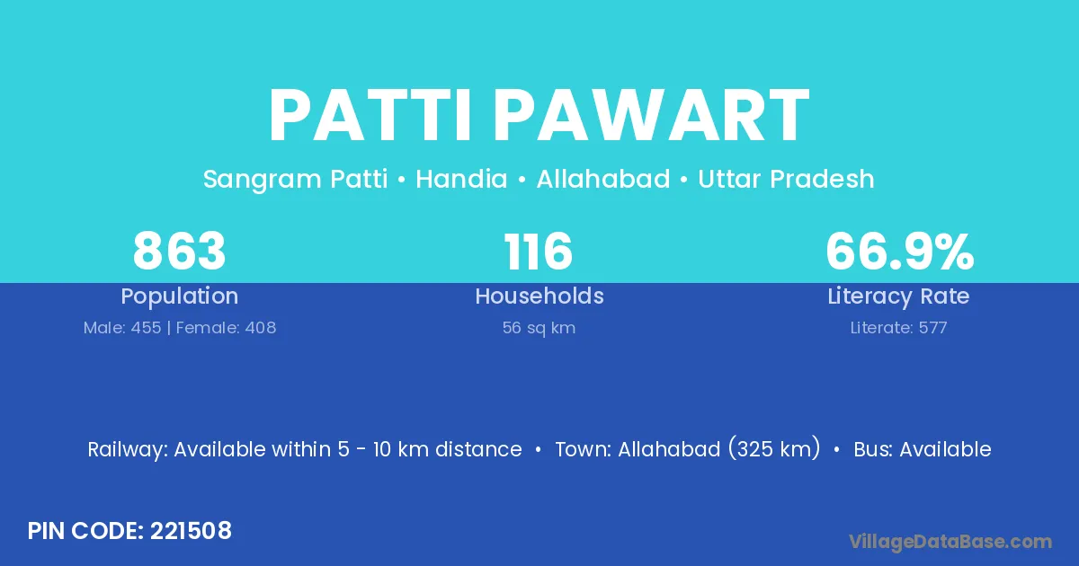 Allahabad (325 km) is the nearest town to Patti Pawart village for major economic activities and is located approximately 325 km away.