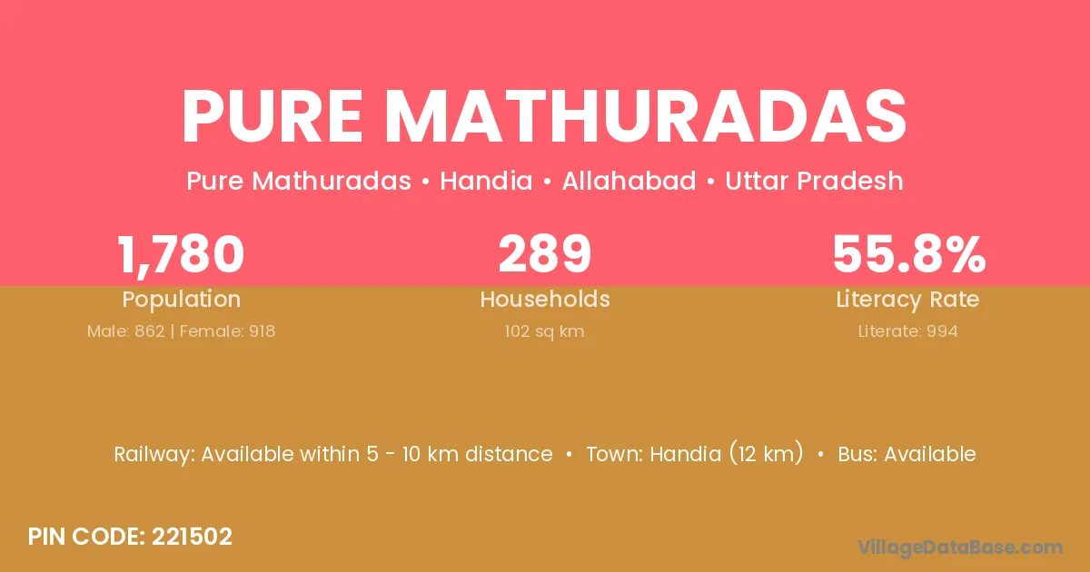 Pure Mathuradas village has a total population of 1,780 people, of which 862 are males and 918 are females.