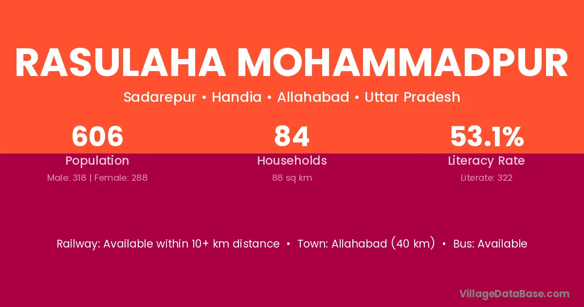 Allahabad (40 km) is the nearest town to Rasulaha Mohammadpur village for major economic activities and is located approximately 40 km away.