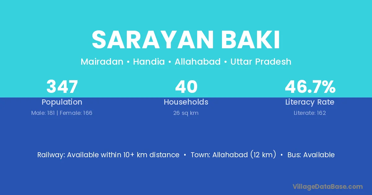Allahabad (12 km) is the nearest town to Sarayan Baki village for major economic activities and is located approximately 12 km away.
