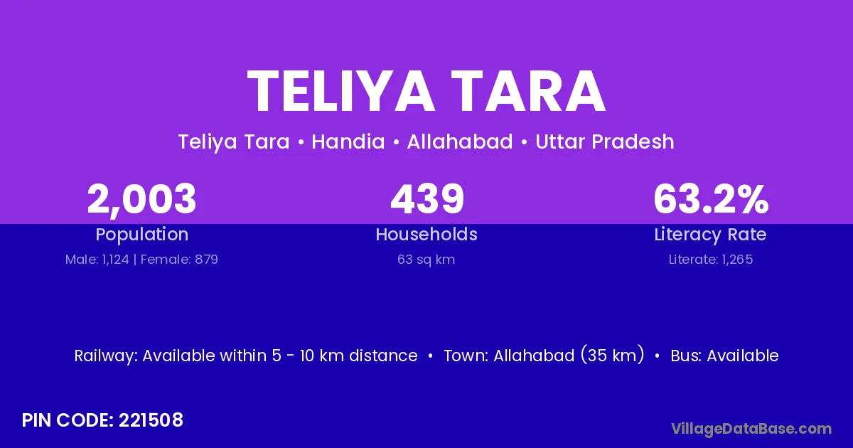 Allahabad (35 km) is the nearest town to Teliya Tara village for major economic activities and is located approximately 35 km away.