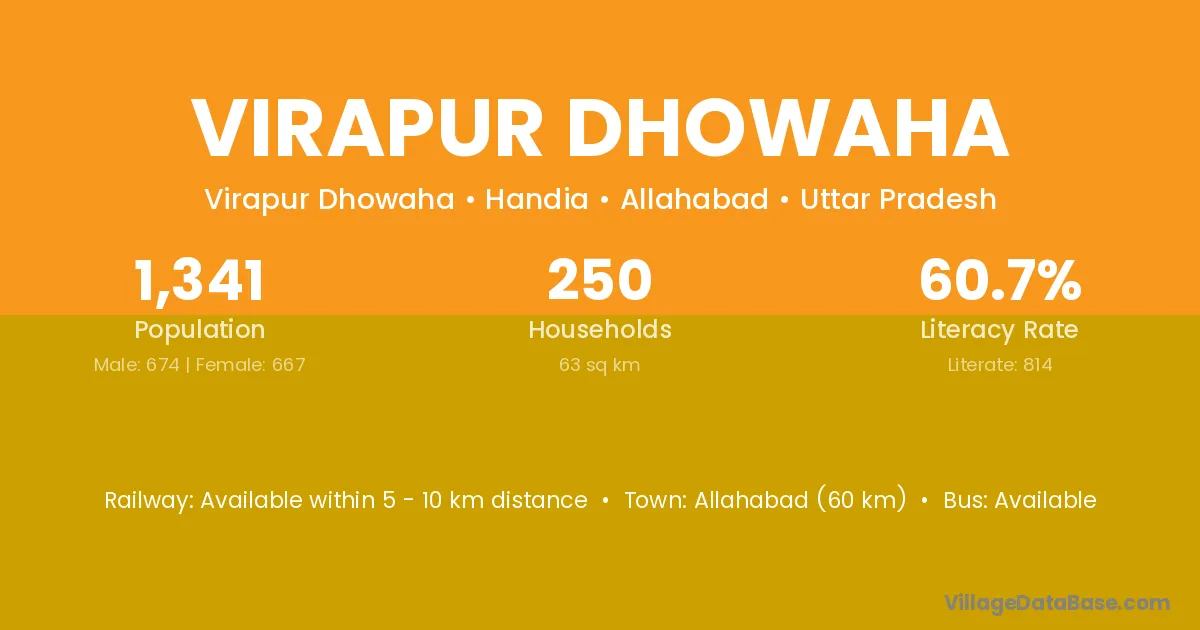 Allahabad (60 km) is the nearest town to Virapur Dhowaha village for major economic activities and is located approximately 60 km away.