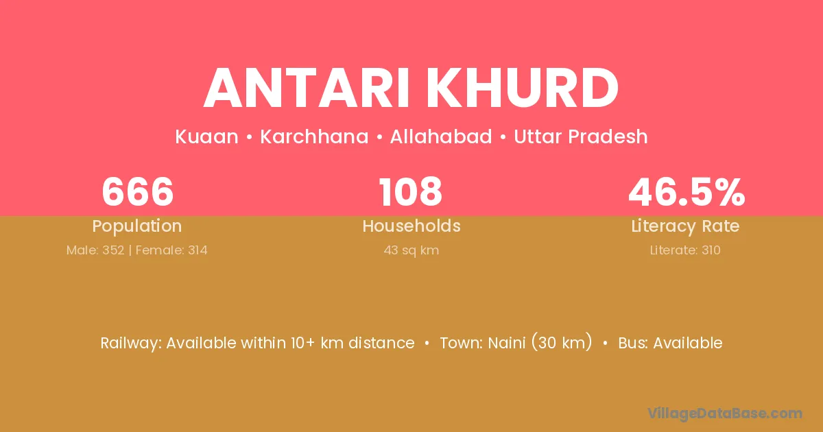 Naini (30 km) is the nearest town to Antari Khurd village for major economic activities and is located approximately 30 km away.
