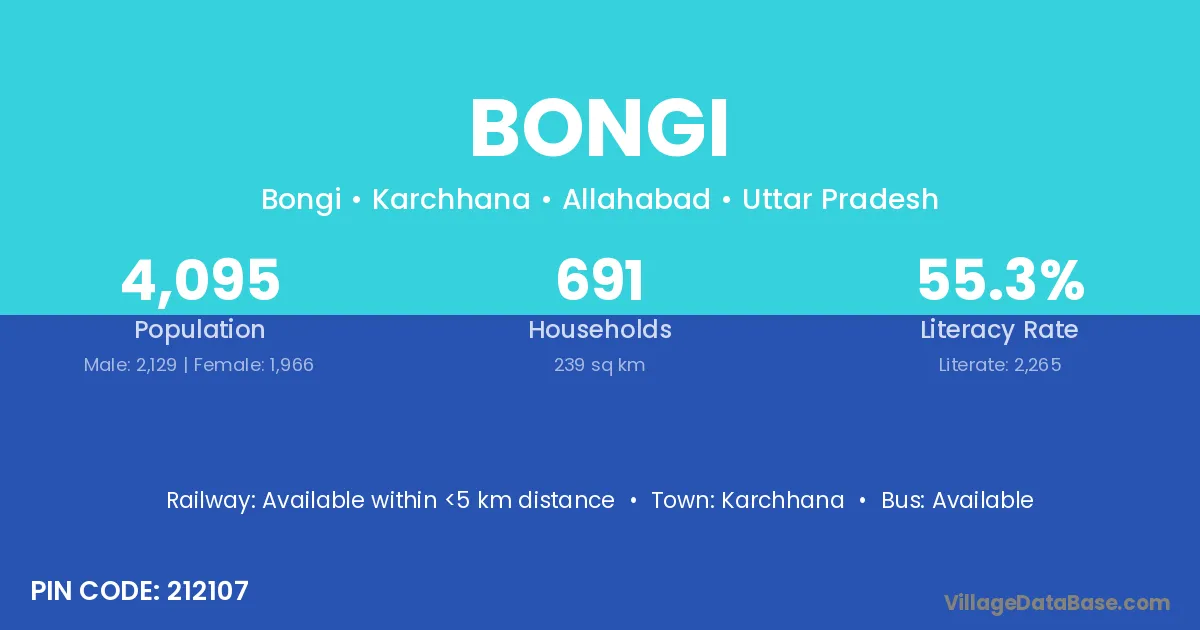 Bongi village is located in the Karchhana Tehsil of the Allahabad district in Uttar Pradesh .