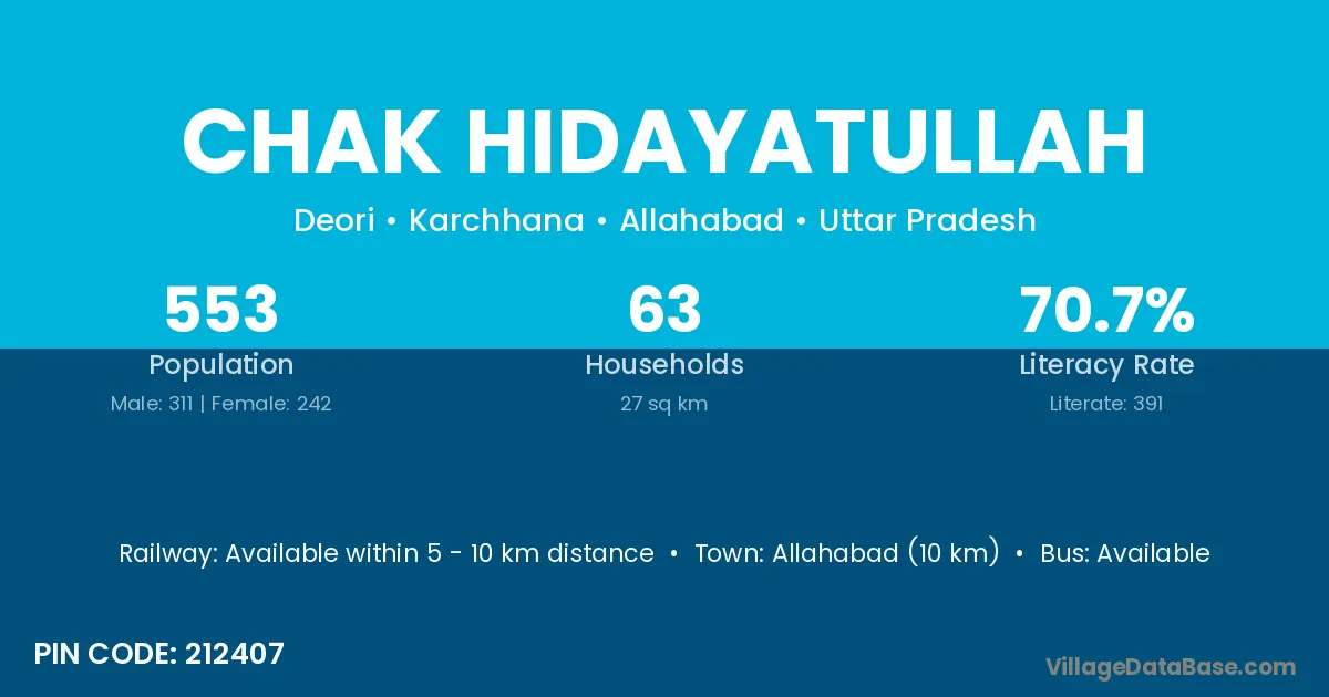 Allahabad (10 km) is the nearest town to Chak Hidayatullah village for major economic activities and is located approximately 10 km away.