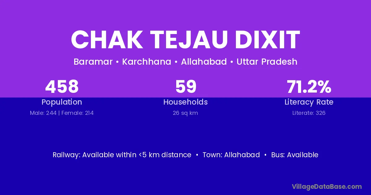 Chak Tejau Dixit village has a total population of 458 people, of which 244 are males and 214 are females.
