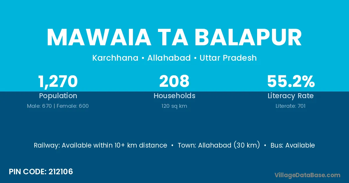 Allahabad (30 km) is the nearest town to Mawaia Ta Balapur village for major economic activities and is located approximately 30 km away.