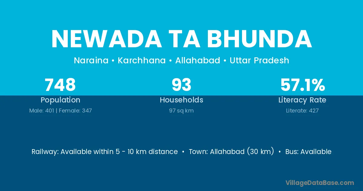 Allahabad (30 km) is the nearest town to Newada Ta Bhunda village for major economic activities and is located approximately 30 km away.