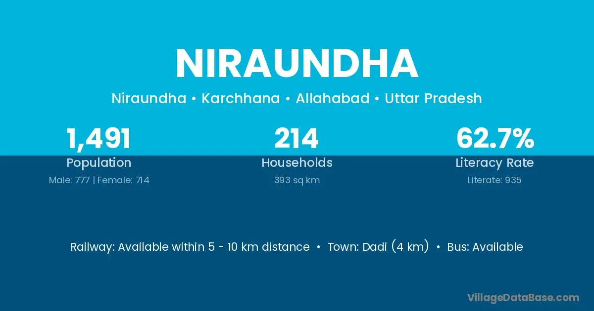 Niraundha village has a total population of 1,491 people, of which 777 are males and 714 are females.