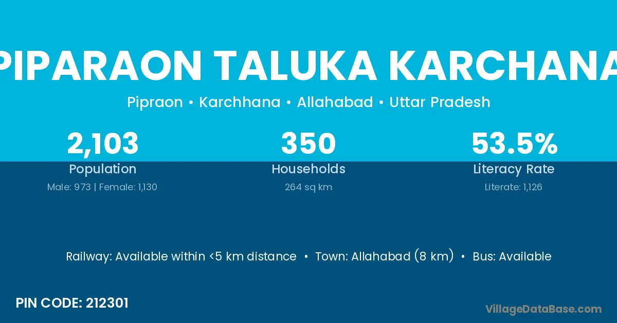 Allahabad (8 km) is the nearest town to Piparaon Taluka Karchana village for major economic activities and is located approximately 8 km away.