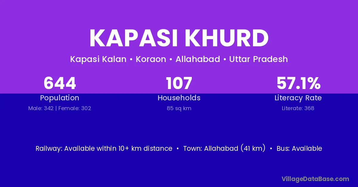 Allahabad (41 km) is the nearest town to Kapasi Khurd village for major economic activities and is located approximately 41 km away.