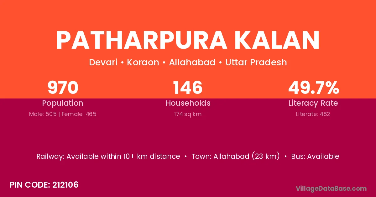 Allahabad (23 km) is the nearest town to Patharpura Kalan village for major economic activities and is located approximately 23 km away.
