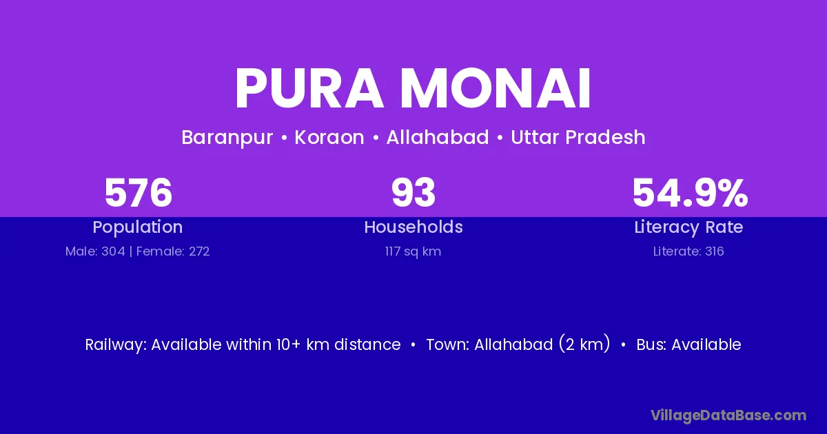 Allahabad (2 km) is the nearest town to Pura Monai village for major economic activities and is located approximately 2 km away.
