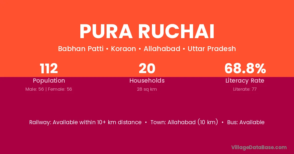 Pura Ruchai village has a total population of 112 people, of which 56 are males and 56 are females.