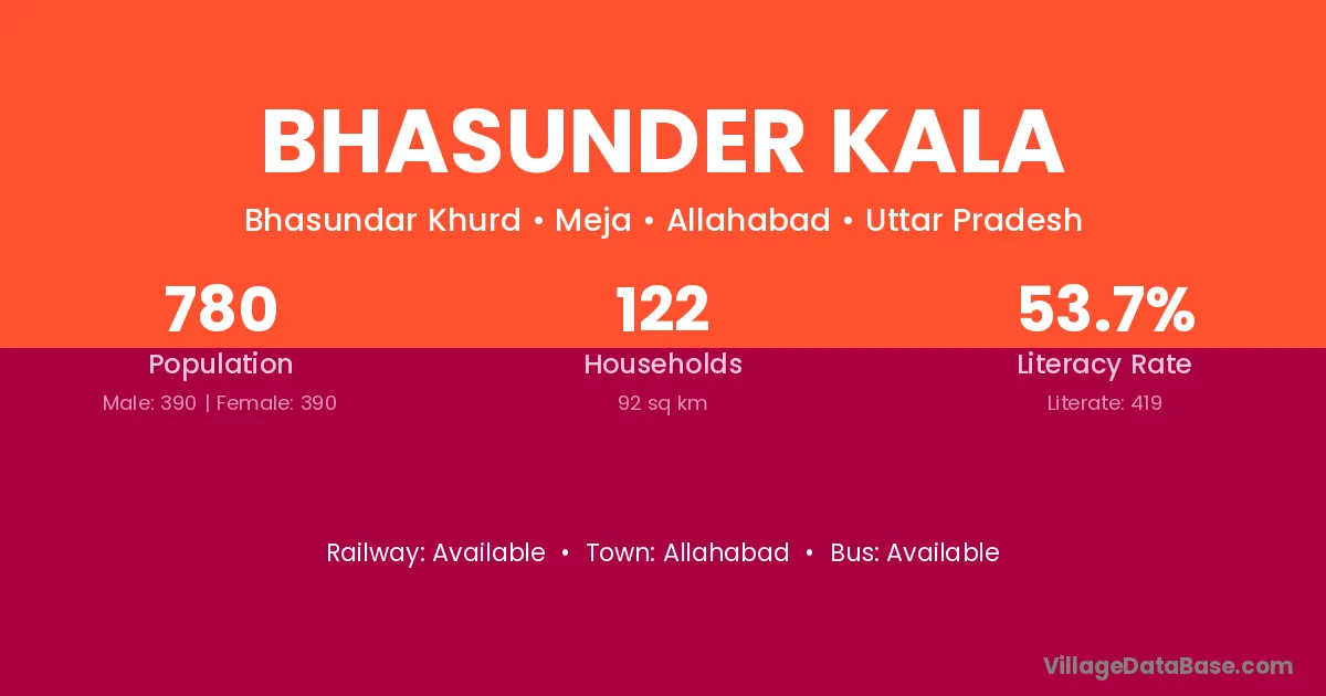 Bhasunder Kala village has a total population of 780 people, of which 390 are males and 390 are females.