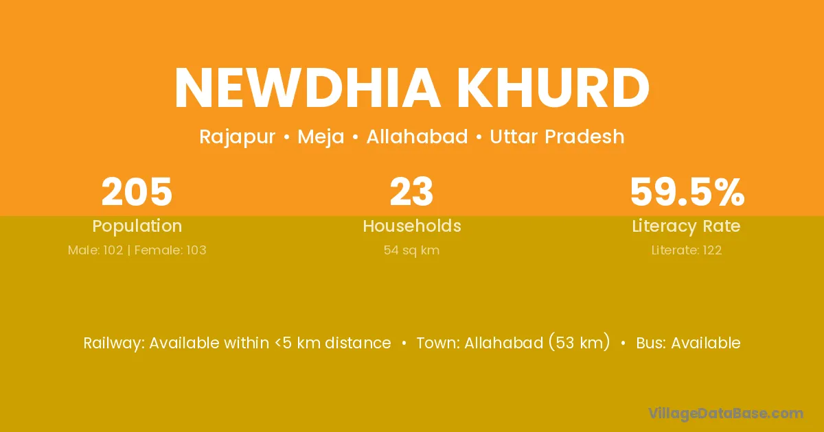 Allahabad (53 km) is the nearest town to Newdhia Khurd village for major economic activities and is located approximately 53 km away.