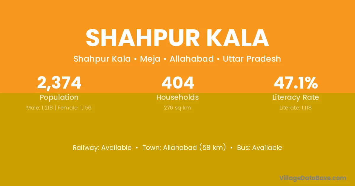Allahabad (58 km) is the nearest town to Shahpur Kala village for major economic activities and is located approximately 58 km away.