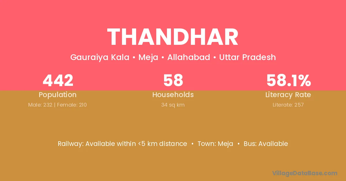 Thandhar village has a total population of 442 people, of which 232 are males and 210 are females.