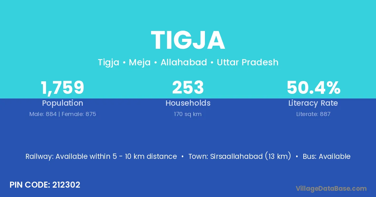 Sirsaallahabad (13 km) is the nearest town to Tigja village for major economic activities and is located approximately 13 km away.