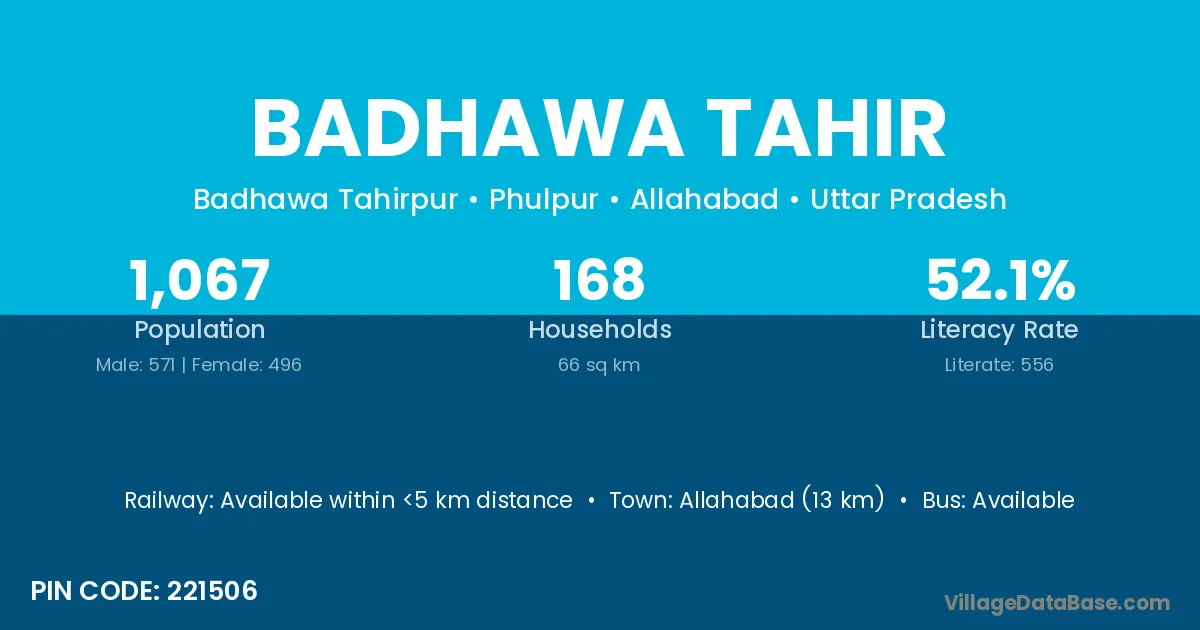 Allahabad (13 km) is the nearest town to Badhawa Tahir village for major economic activities and is located approximately 13 km away.