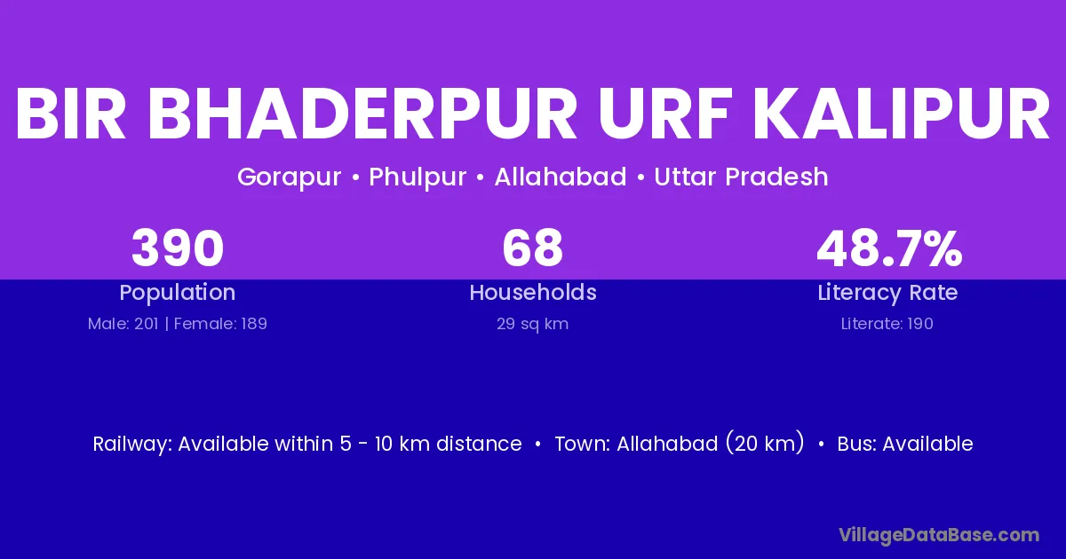 Allahabad (20 km) is the nearest town to Bir Bhaderpur Urf Kalipur village for major economic activities and is located approximately 20 km away.