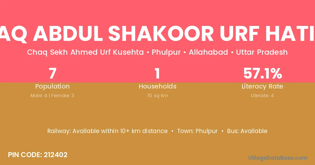 Chaq Abdul Shakoor Urf Hatia G village has a total population of 7 people, of which 4 are males and 3 are females.