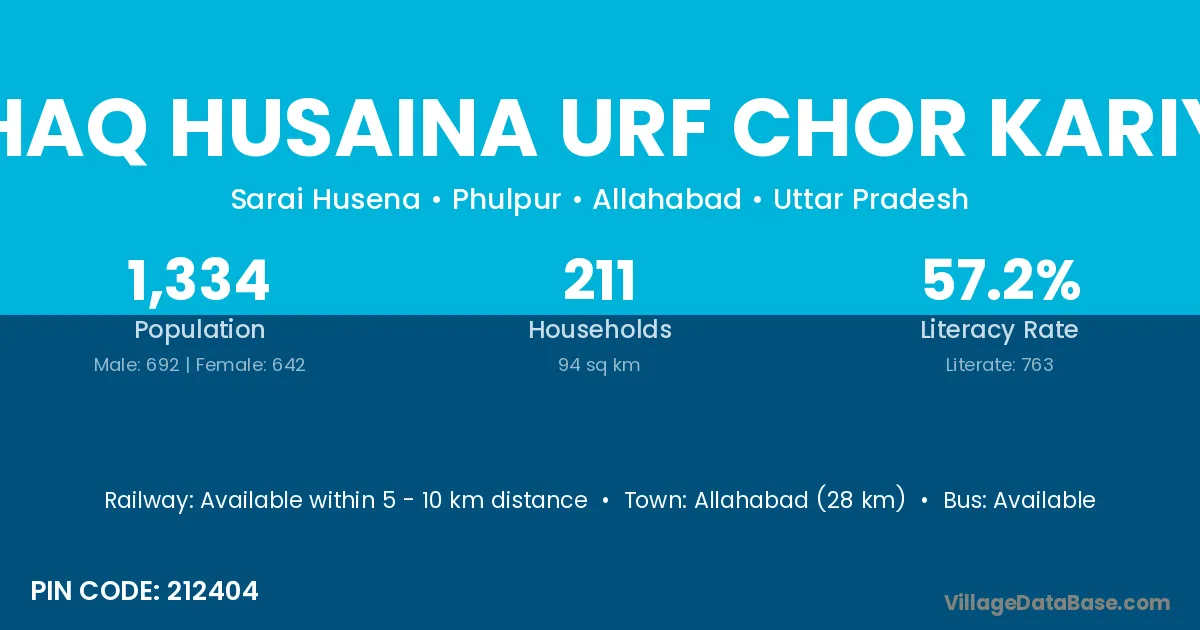 Allahabad (28 km) is the nearest town to Chaq Husaina Urf Chor Kariya village for major economic activities and is located approximately 28 km away.