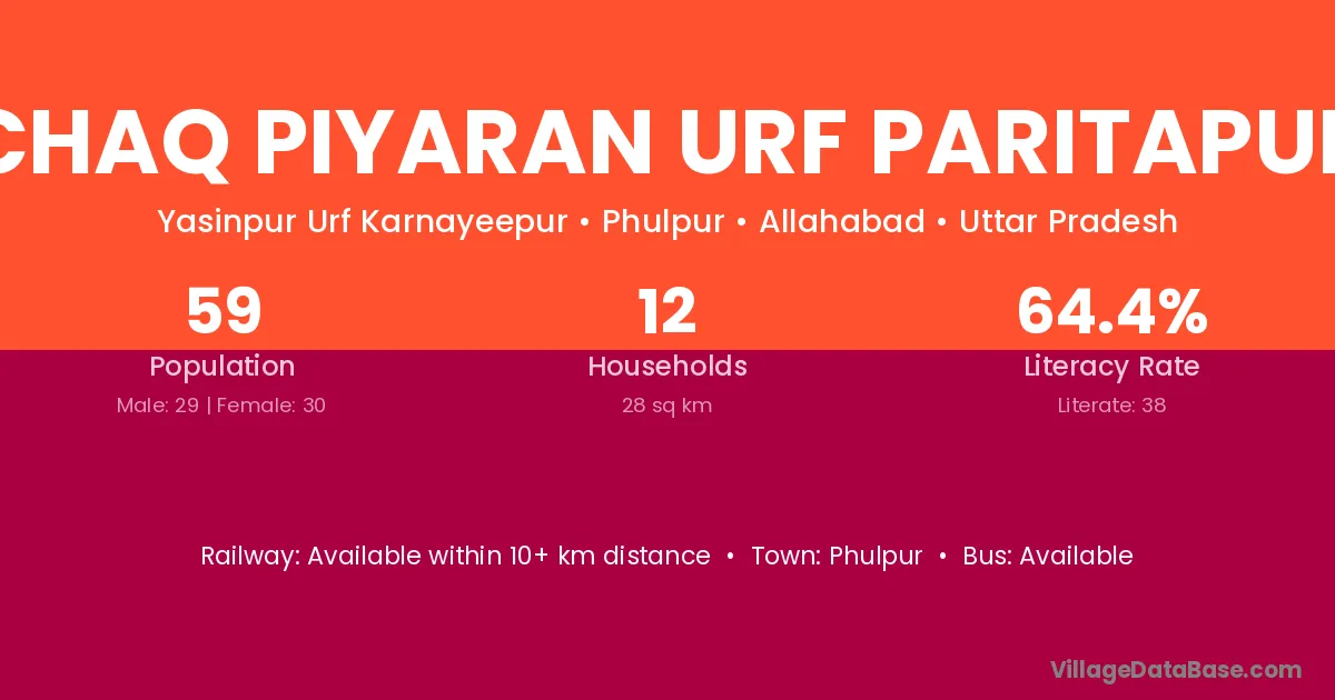 Chaq Piyaran Urf Paritapur village has a total population of 59 people, of which 29 are males and 30 are females.