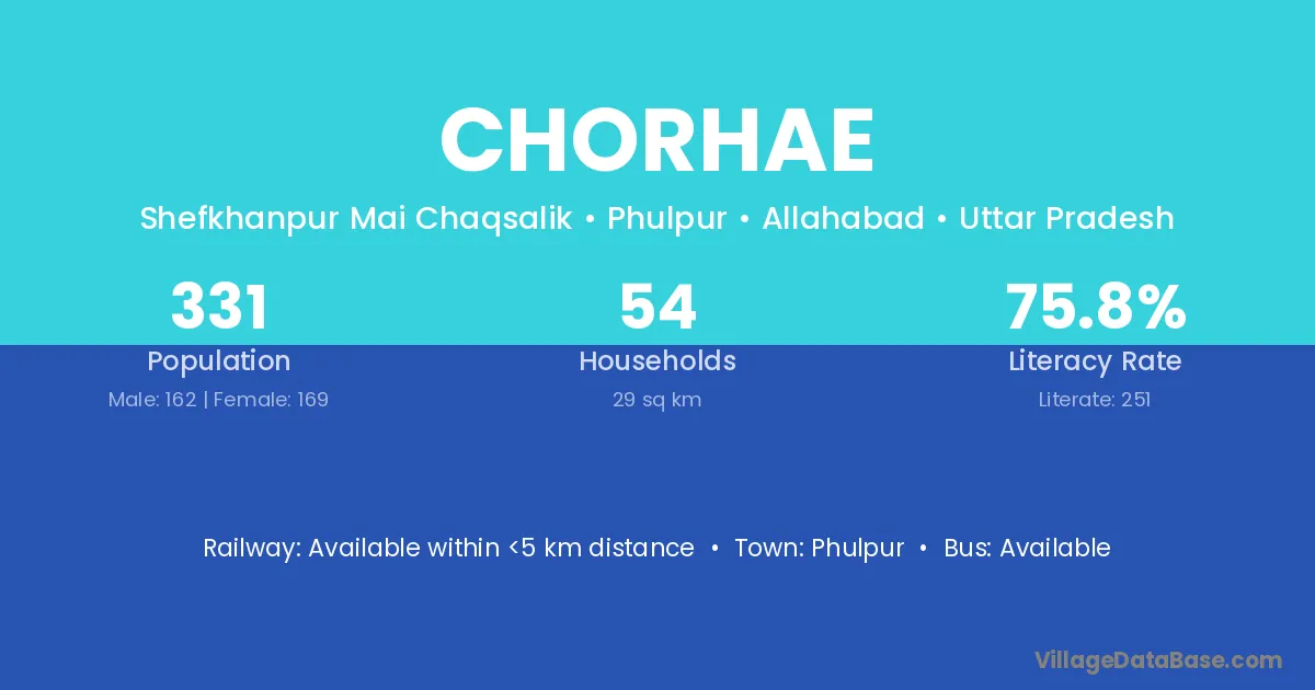 Chorhae village has a total population of 331 people, of which 162 are males and 169 are females.