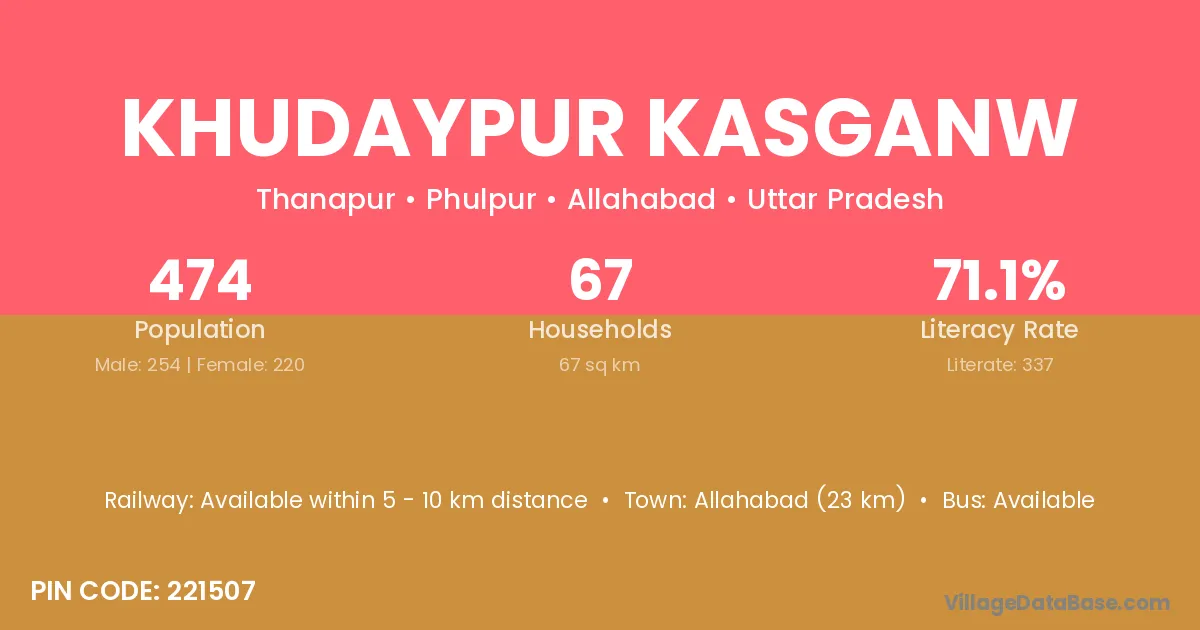 Allahabad (23 km) is the nearest town to Khudaypur Kasganw village for major economic activities and is located approximately 23 km away.