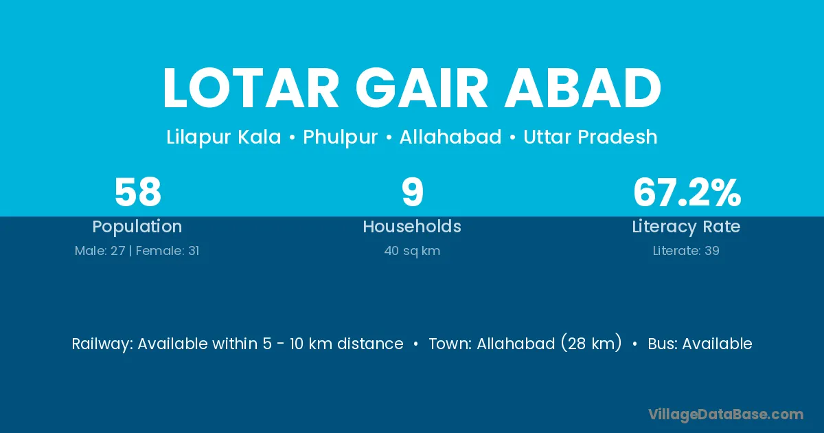 Allahabad (28 km) is the nearest town to Lotar Gair Abad village for major economic activities and is located approximately 28 km away.