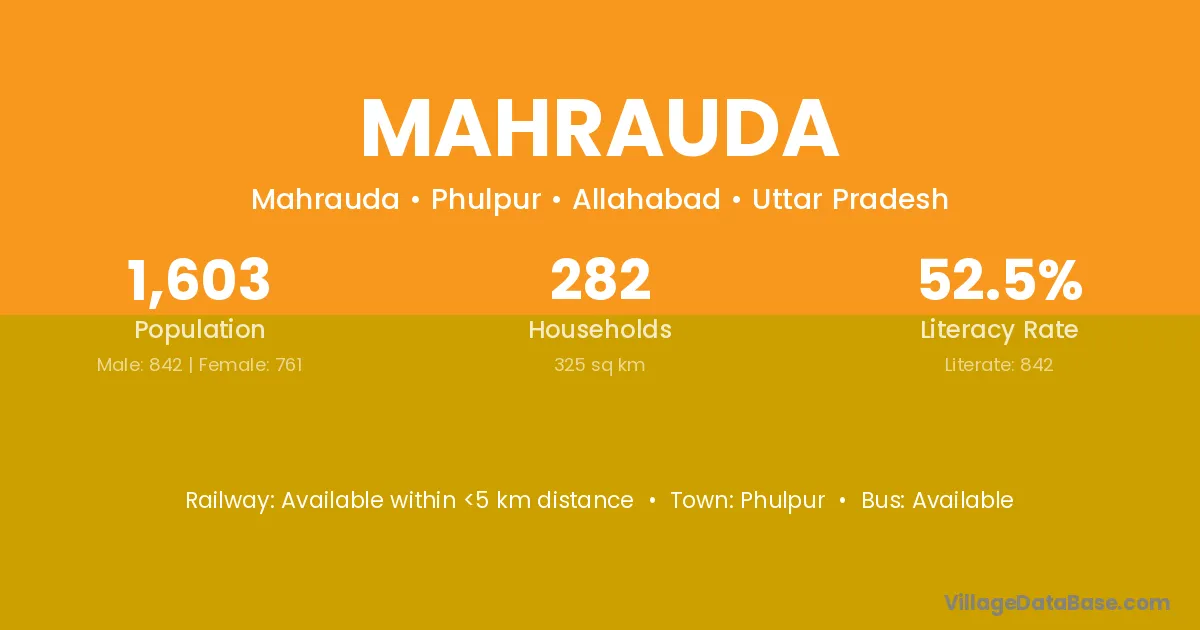 Mahrauda village has a total population of 1,603 people, of which 842 are males and 761 are females.