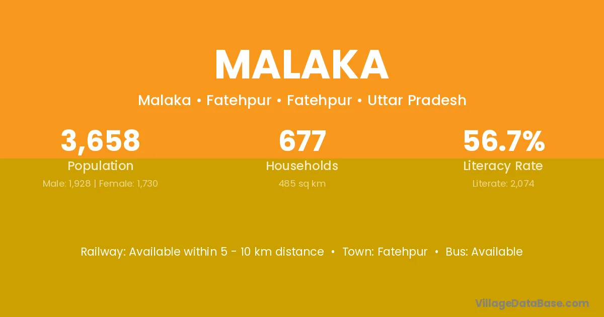 The literacy rate of Malaka village is 59.40%. Male literacy stands at 73.63% and female literacy at 42.19%.