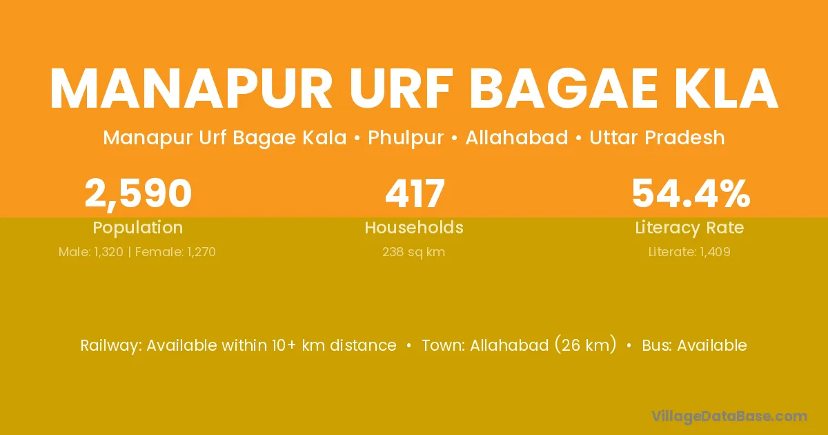 Allahabad (26 km) is the nearest town to Manapur Urf Bagae Kla village for major economic activities and is located approximately 26 km away.