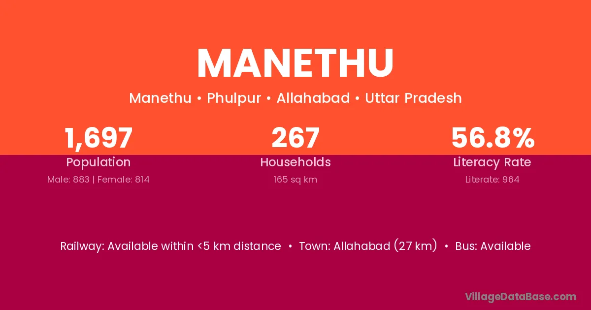 Allahabad (27 km) is the nearest town to Manethu village for major economic activities and is located approximately 27 km away.