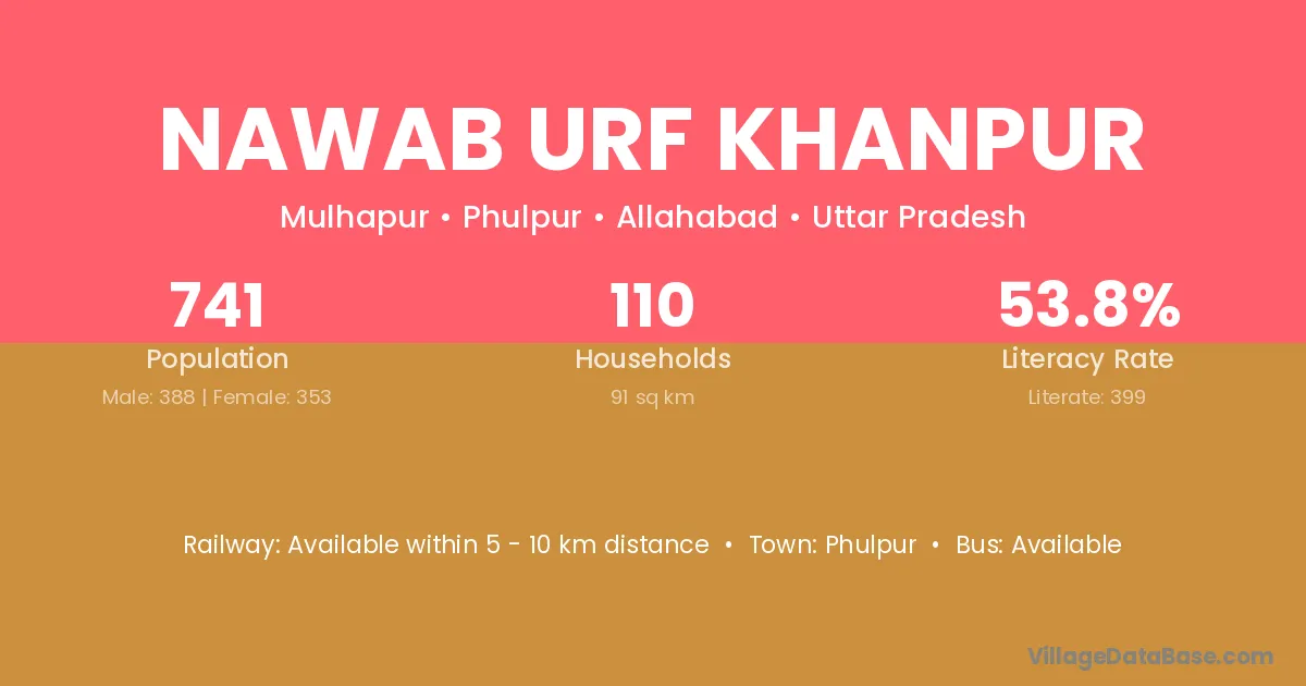 Nawab Urf Khanpur village has a total population of 741 people, of which 388 are males and 353 are females.
