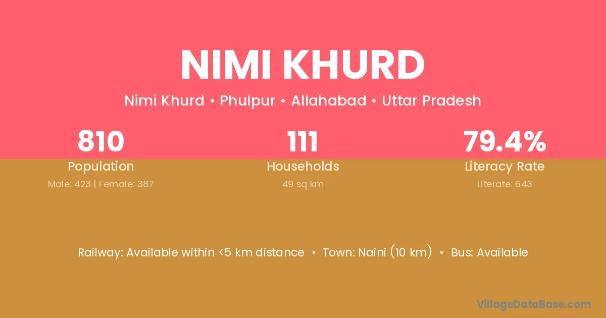 Naini (10 km) is the nearest town to Nimi Khurd village for major economic activities and is located approximately 10 km away.