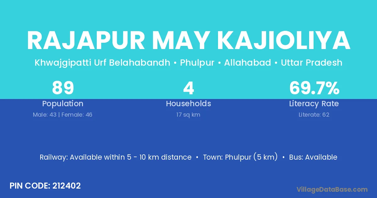 Phulpur (5 km) is the nearest town to Rajapur May Kajioliya village for major economic activities and is located approximately 5 km away.