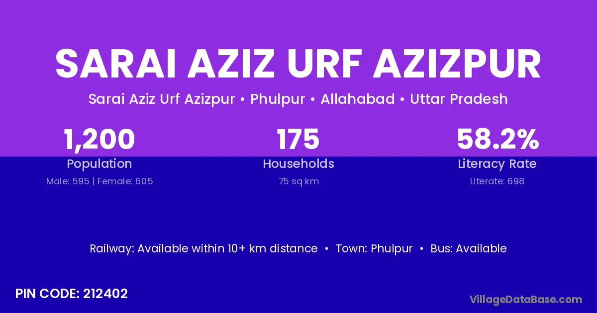 Sarai Aziz Urf Azizpur village has a total population of 1,200 people, of which 595 are males and 605 are females.