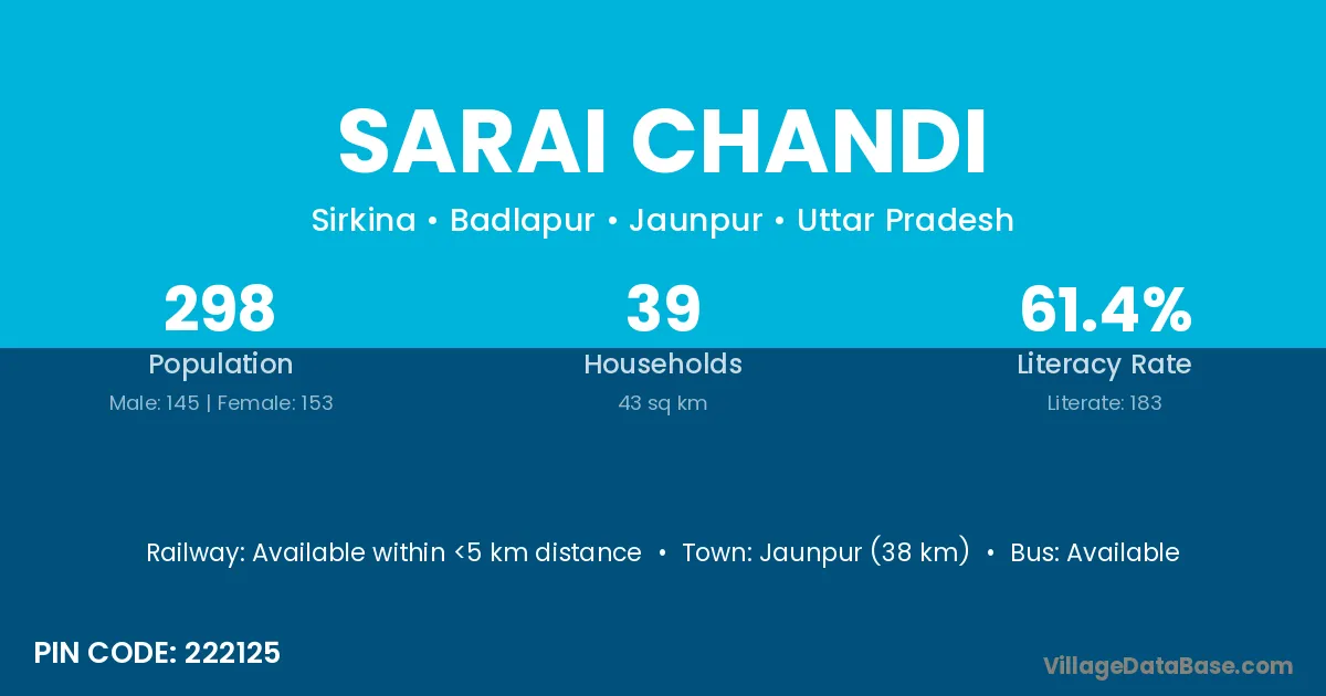 The literacy rate of Sarai Chandi village is 55.10%. Male literacy stands at 63.52% and female literacy at 45.19%.