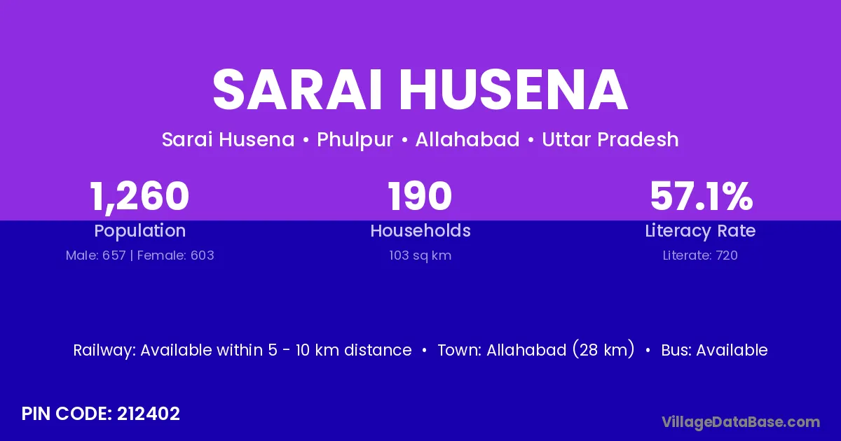 Allahabad (28 km) is the nearest town to Sarai Husena village for major economic activities and is located approximately 28 km away.
