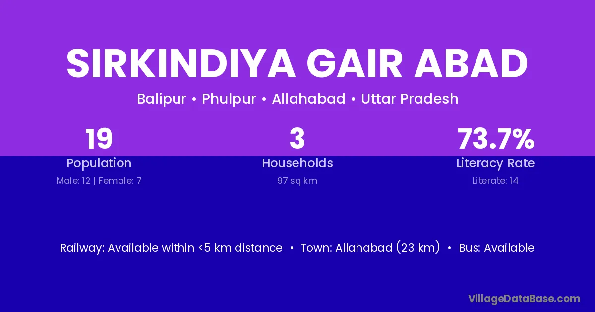 Allahabad (23 km) is the nearest town to Sirkindiya Gair Abad village for major economic activities and is located approximately 23 km away.