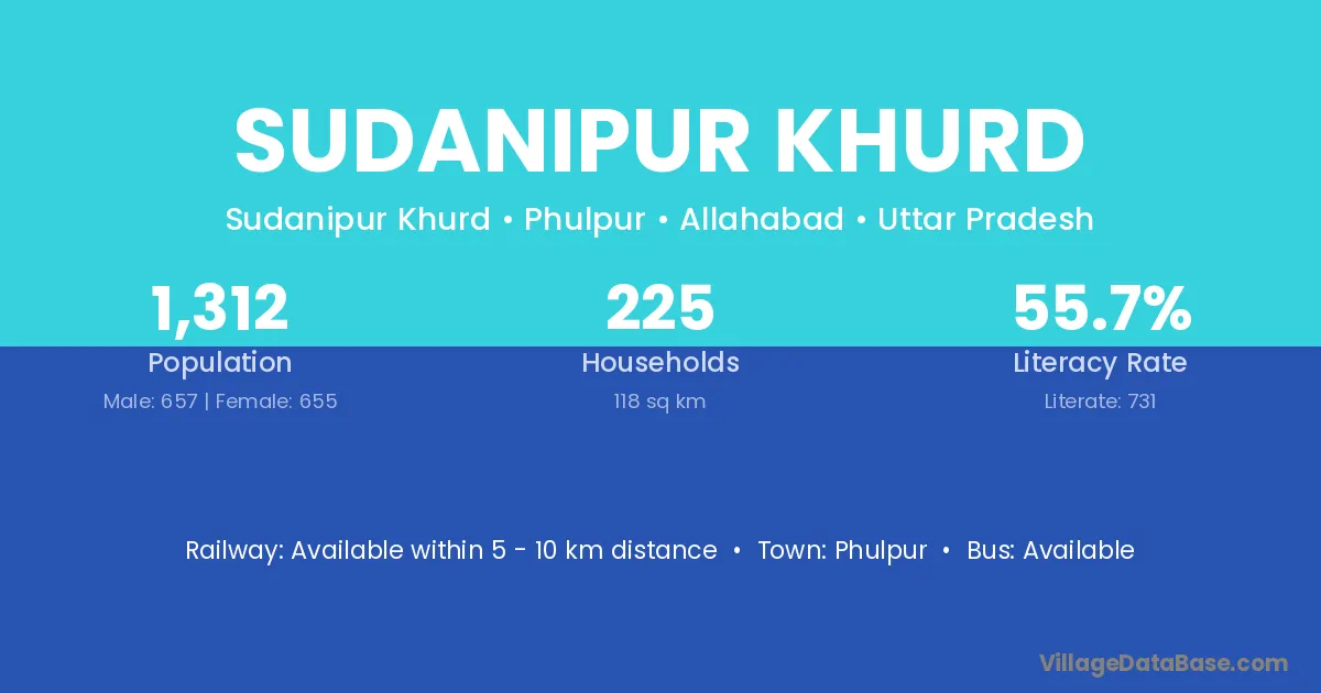 Sudanipur Khurd village has a total population of 1,312 people, of which 657 are males and 655 are females.