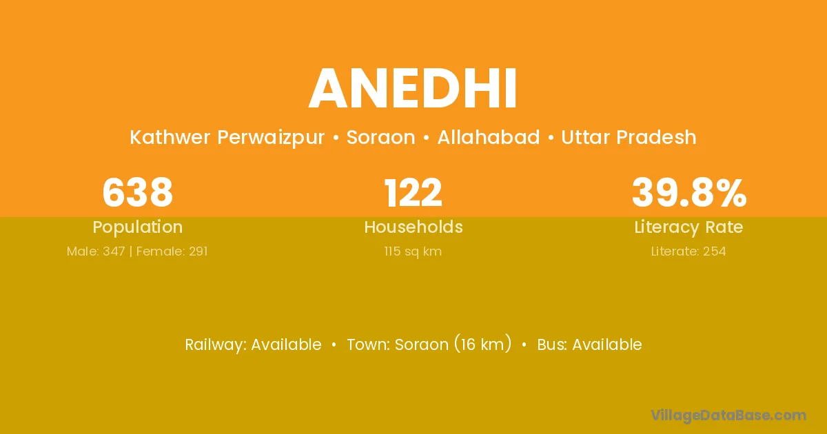 Soraon (16 km) is the nearest town to Anedhi village for major economic activities and is located approximately 16 km away.