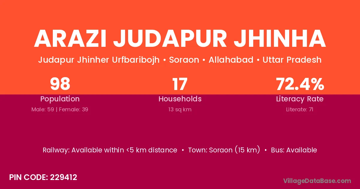 Soraon (15 km) is the nearest town to Arazi Judapur Jhinha village for major economic activities and is located approximately 15 km away.