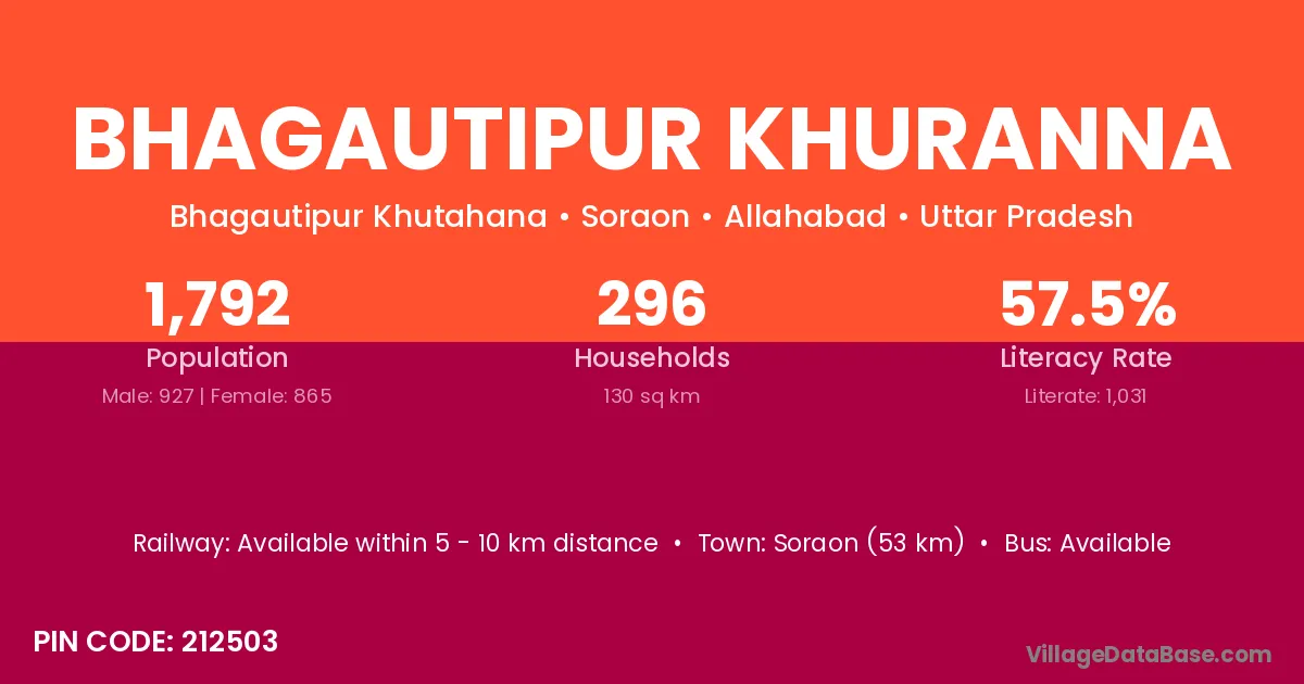 Soraon (53 km) is the nearest town to Bhagautipur Khuranna village for major economic activities and is located approximately 53 km away.