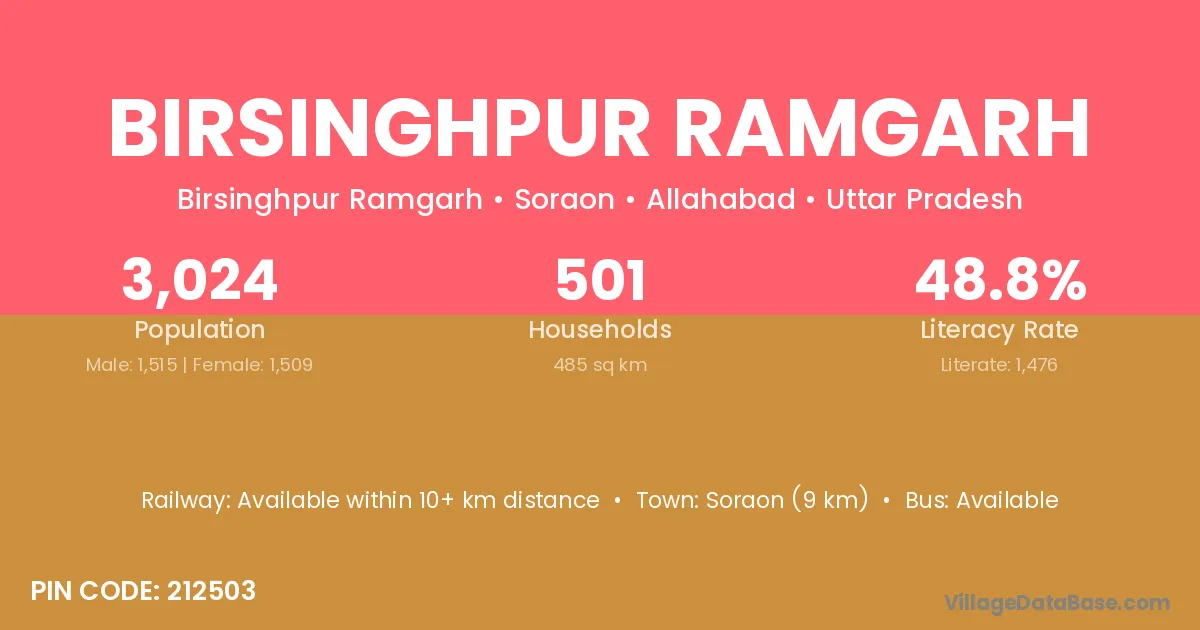 Soraon (9 km) is the nearest town to Birsinghpur Ramgarh village for major economic activities and is located approximately 9 km away.
